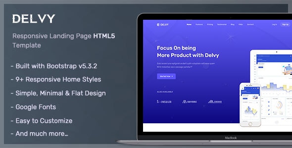 Delvy is Startup Landing Page, Responsive quick and easy customizable Modern Startup Landing Page Template that comes with 9 home page variations. It’s fully responsive and built
